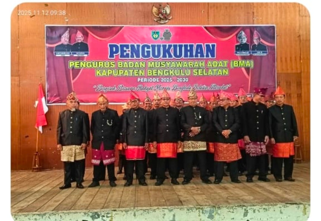 Bengkulu Selatan Relasiublik.com Pengurus Badan Musyawarah Adat (BMA) Kabupaten Bengkulu Selatan Provinsi Bengkulu resmi dikukuhkan. Acara penting ini merupakan babak baru dalam upaya pelestarian warisan budaya dan penguatan peran lembaga adat di Bengkulu Selatan, Rabo 12/11/2025.